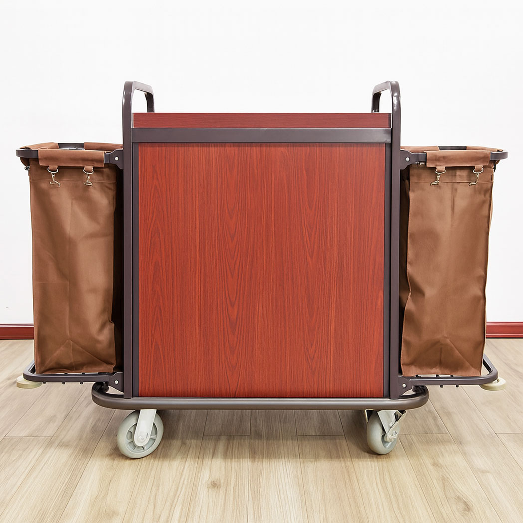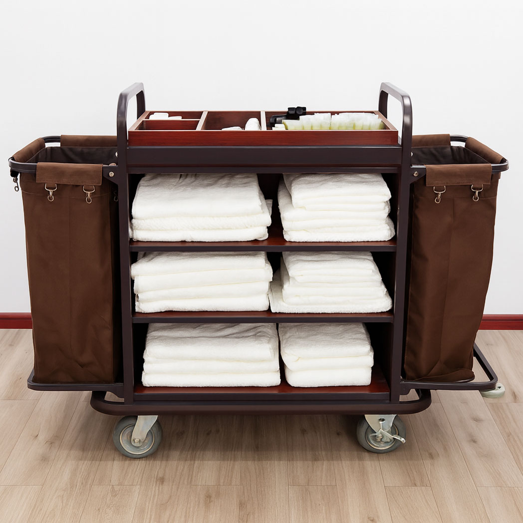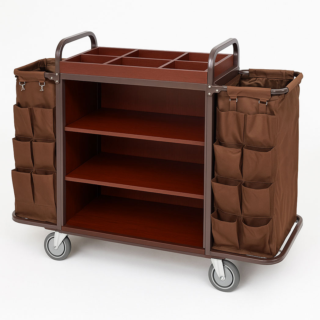 Upgrade your hotel operations with our professional Hotel Housekeeping Cart – Classic Linen & Amenities Trolley. Designed for efficiency and durability, this cart provides spacious storage for clean linen, removable side bags for dirty laundry, and a convenient amenities tray. Built with a sturdy steel frame and protective bumper, it ensures smooth mobility and long-lasting use in hotels, resorts, and cleaning services.